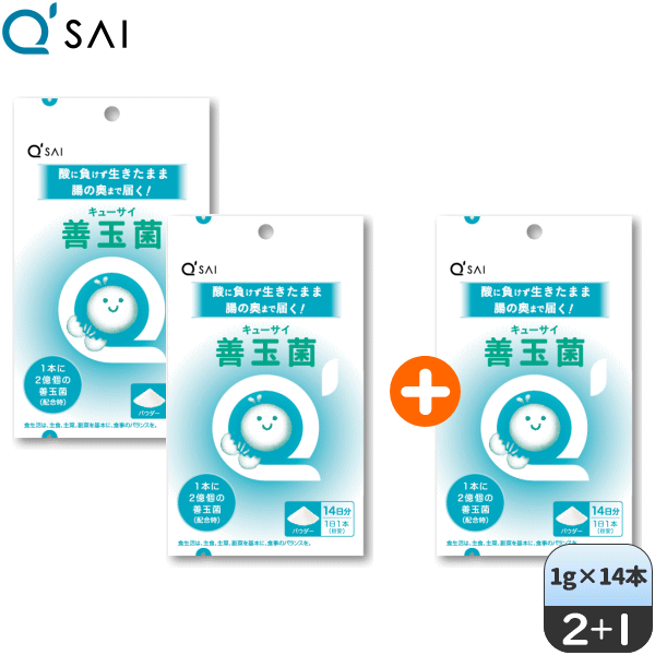キューサイ善玉菌は、胞子(カラ)に包まれた「有胞子性乳酸菌」です。 ▼商品特長 酸を浴びてもカラが守ってくれるので、生きたまま腸まで到達します。この有胞子性乳酸菌が、1本(1g)あたり2億個(配合時)。水などに溶かして、手軽に善玉菌を補いましょう。あまずっぱいヨーグルト味です。 メーカー希望小売価格はメーカーカタログに基づいて掲載しています 「2袋購入+もう1袋プレゼント」はこちら! (2025/9/1〜2025/11/30まで)商品情報 内容量 1袋あたり1g×14本入り 1日目安量 1本。 お召し上がり方 1日1本を目安に、水などと一緒にお召し上がりください。 賞味期限 商品パッケージをご確認ください。 保存方法 直射日光・高温多湿を避けて保存してください。 原材料名 乳糖、フラクトオリゴ糖、有胞子性乳酸菌末、ミルクカルシウム、ビタミンC 栄養成分:1本(1g)あたり エネルギー/3.... |