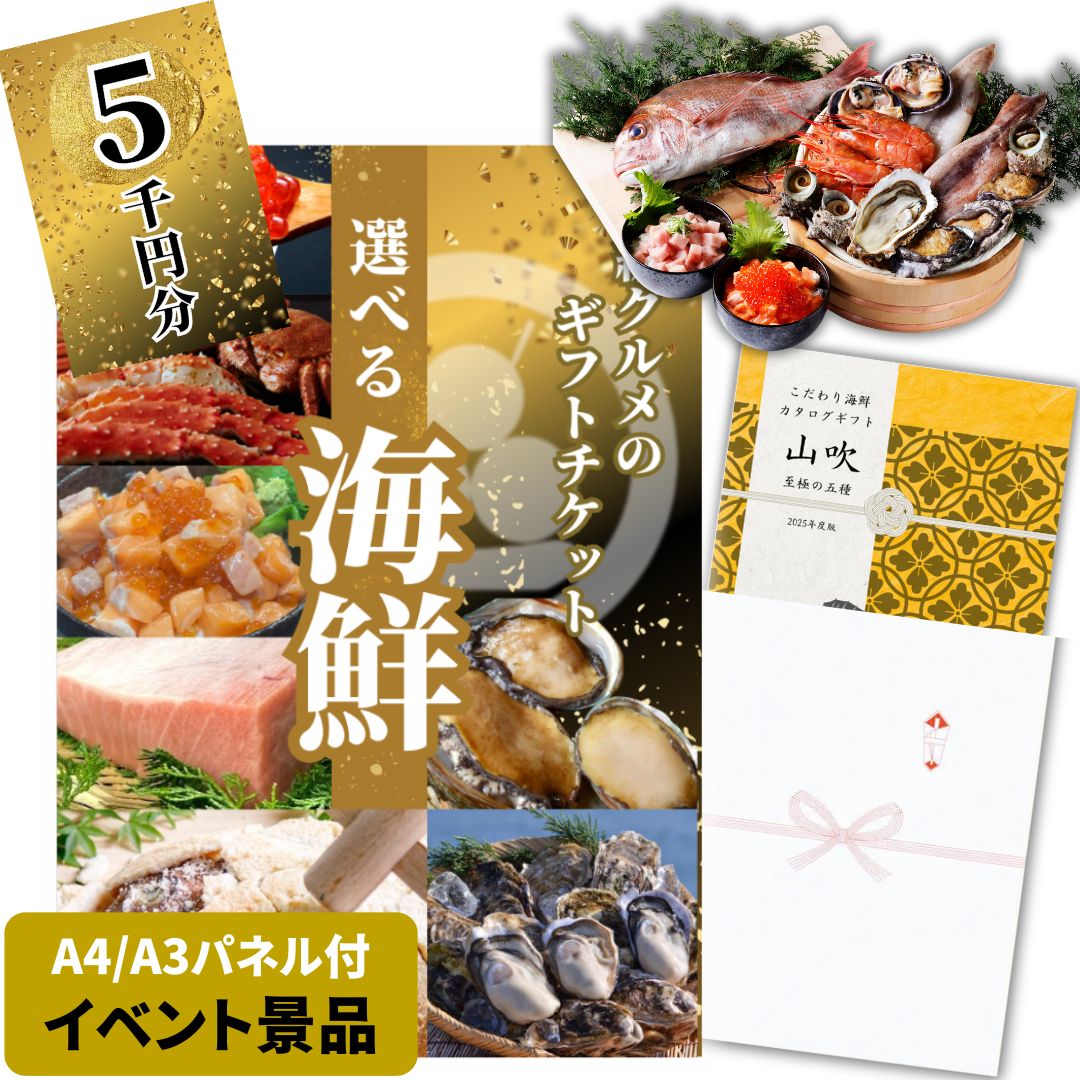 【イベント景品】高級海鮮チケット5000円コース(A4・A3パネル付き)グルメカタログギフト 詰め合わせセット 交換引換券 二次会 景品 結婚式 披露宴 ビンゴ 景品 ゴルフコンペ 景品 食品 単品 目録 忘年会 粗品 イベント景品 2次会景品 5千円コース 賞品 送料無料 送別会 高級海鮮をイベント景品にしてみませんか?仲卸とコラボして厳選した、本当に美味しい5000円分の魚介セット・大人気の「至極の五選シリーズ」です!5つの海鮮セットから選べます。 【グルメな方も大満足!】食にこだわりのある方にこそ味わっていただきたい、本当に美味しい海鮮を詰め合わせました!足が早い海鮮だからこそ、もらった方がご在宅のご都合に合わせて注文していただけるのが嬉しい!レビューも高評価です!【とれたての味を再現!】冷凍方法にもこだわりあり!!海鮮が一番美味しくなる特殊技術「CAS冷凍」を採用しています。細胞が... |