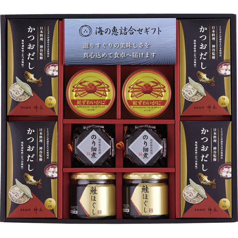 セット内容:日本料理神谷監修かつおだし(4g×8)×4、のり佃煮(80g)・紅ずわいがにほぐし身(55g)・鮭ほぐし(50g)×各2箱サイズ:約30.1×34.1×7.4cm賞味期間:常温1年アレルギー:乳・小麦・かに箱入重量:約1.7kg ※北海道・沖縄・離島など一部お届けできない地域、また別料金を頂く地域もございます。 あらゆるギフトシーンにどうぞ 内祝い お返し 出産 出産内祝い 結婚 結婚内祝い 御礼 快気祝い 快気内祝い 御見舞御礼 全快祝い お祝い 結婚式 引き出物 結婚祝い 結婚内祝い 引越しご挨拶 父の日 母の日 敬老の日 入学内祝い 入園内祝い 成人式 初節句 新築内祝い 粗品 記念品 二次会 景品 周年記念 コンペ景品 プレゼント 誕生日 お中元 残暑見舞い お歳暮 御年賀 贈答品 総合通販 一周忌 三回忌 法事引出物 香典返し 初盆 志 回忌法要 還暦御祝い 開店お祝... |