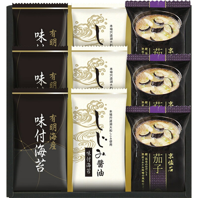 セット内容:有明海産味付海苔・しじみ醤油味付海苔(各8切8枚)×各6、マルコメ京懐石長ねぎのおみそ汁(15.7g)・マルコメ京懐石茄子のおみそ汁(11.5g)×各3箱サイズ:約24.5×24×10cm賞味期間:常温1年5ヶ月アレルギー:小麦箱入重量:約0.7kg ※北海道・沖縄・離島など一部お届けできない地域、また別料金を頂く地域もございます。 あらゆるギフトシーンにどうぞ 内祝い お返し 出産 出産内祝い 結婚 結婚内祝い 御礼 快気祝い 快気内祝い 御見舞御礼 全快祝い お祝い 結婚式 引き出物 結婚祝い 結婚内祝い 引越しご挨拶 父の日 母の日 敬老の日 入学内祝い 入園内祝い 成人式 初節句 新築内祝い 粗品 記念品 二次会 景品 周年記念 コンペ景品 プレゼント 誕生日 お中元 残暑見舞い お歳暮 御年賀 贈答品 総合通販 一周忌 三回忌 法事引出物 香典返し 初盆 志 回忌法要... |
