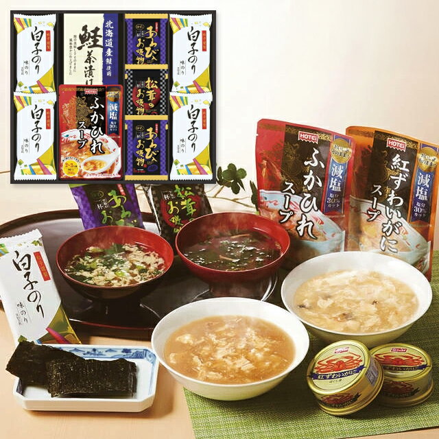 商品内容 ●ふかひれスープ160g・松茸入お吸い物4.2g・あわび入お吸い物4g各2袋・紅ずわいがにスープ160g×1袋・白子のり(8切5枚)3袋・甘海老のみそ汁(7.5g×2袋)・丸美屋海苔茶漬け(6g×4袋)各1箱・紅ずわいがにほぐし身55g×3缶・賞味期間/製造日より常温約360日・[日本製]・【卵・乳成分・小麦・あわび・えび・かに・ごま・さば・大豆・鶏肉・豚肉・ゼラチン】・46.3×29×4.2cm・80サイズ・1195g あわび、松茸の高級素材を使ったフリーズドライとふかひれスープ、紅ずわいがにスープと白子のりを詰め合わせた贅沢な贈り物です。※商品の内容・デザイン・価格等が変更になる事がございます。ご了承ください。 ※北海道・沖縄・離島など一部お届けできない地域、また別料金を頂く地域もございます。 あらゆるギフトシーンにどうぞ内祝い お返し 出産 出産内祝い 結婚 結婚内祝い 御... |