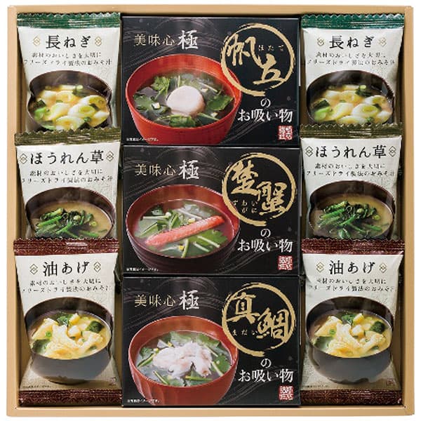 商品内容:フリーズドライ味噌汁(油あげ7.2g・ほうれん草6.2g・長ねぎ6.3g各3袋)・フリーズドライお吸い物(真鯛6.2g・帆立7.4g・楚蟹5.2g各1袋)・賞味期間/製造日より常温約360日・[日本製]・【小麦・かに・大豆】箱サイズ:約35.4×29.2×2.5cm箱重量:約330g ※商品内容・デザイン・価格等変更になる場合がございます。 あらゆるギフトシーンにどうぞ 内祝い お返し 出産 出産内祝い 結婚 結婚内祝い 御礼 快気祝い 快気内祝い 御見舞御礼 全快祝い お祝い 結婚式 引き出物 結婚祝い 結婚内祝い 引越しご挨拶 父の日 母の日 敬老の日 入学内祝い 入園内祝い 成人式 初節句 新築内祝い 粗品 記念品 二次会 景品 周年記念 コンペ景品 プレゼント 誕生日 お中元 残暑見舞い お歳暮 御年賀 贈答品 総合通販 一周忌 三回忌 法事引出物 香典返し 初盆 志 回... |