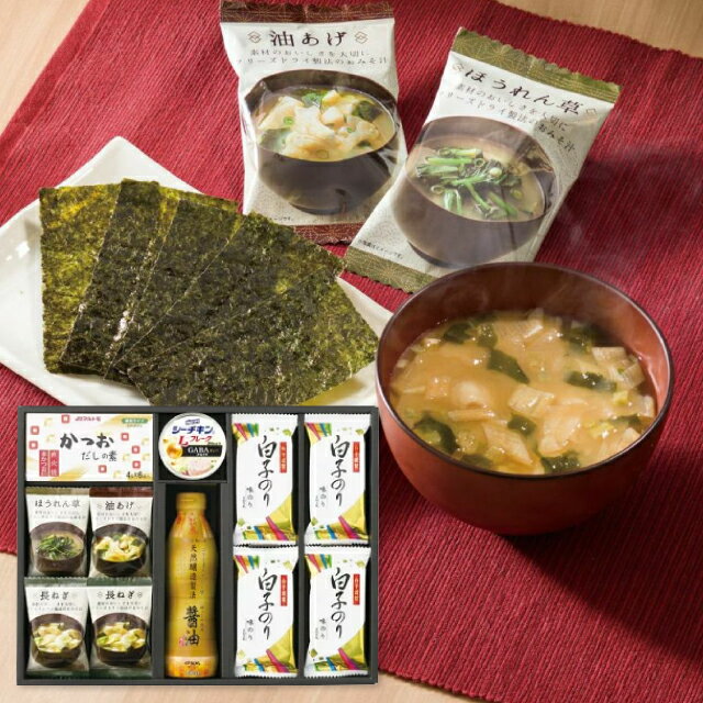 商品内容:フリーズドライ味噌汁(油あげ7.2g・ほうれん草6.2g各1個・長ねぎ6.3g×2個)・伊賀越天然醸造醤油450ml×1本・白子のり味のり(8切5枚)4個・シーチキンLフレークGABA入り70g×1缶・マルトモかつおだしの素(4g×6個)1個・賞味期間/製造日より常温約450日・[日本製]・【乳成分・小麦・えび・大豆】箱サイズ:約41×32×7.3cm箱重量:約1300g ※商品内容・デザイン・価格等変更になる場合がございます。 あらゆるギフトシーンにどうぞ 内祝い お返し 出産 出産内祝い 結婚 結婚内祝い 御礼 快気祝い 快気内祝い 御見舞御礼 全快祝い お祝い 結婚式 引き出物 結婚祝い 結婚内祝い 引越しご挨拶 父の日 母の日 敬老の日 入学内祝い 入園内祝い 成人式 初節句 新築内祝い 粗品 記念品 二次会 景品 周年記念 コンペ景品 プレゼント 誕生日 お中元 残暑見... |