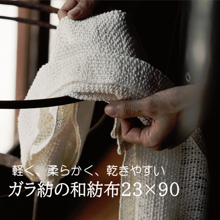 和紡あら織りタオル 他の和紡布製品と同じ糸を使用し、少し目を粗く織りあげました。 肌に当たる面積が少ないため摩擦が少なく、お肌に優しいです。 軽く、吸水性が高いのに乾きやすいので、窓のないバスルームの方におすすめです。 自然の「より」を生かした糸で独特の織り目に仕上げ吸水力抜群(107.5%※普通の布の吸水力は、約75%)の布の為石鹸を使わなくても汚れがおちます。太めの糸をざっくりと平織で織り上げました。拭いてよし、洗ってよし、巻いてよし。益久の定番、健康タオルです。パイル地のタオルのようにループはありませんが、その吸水力と肌ざわりで補ってあまりある使い心地。かさ張らず持ち運びにも便利です。体を洗う時は、よく濡らしてやさしくこするのがポイントです。旅行では枕にかけるだけで、安心の肌ざわり。鉢巻きにして力仕事のお供に。様々なシーンで活用してください。 素材綿100%(ガラ紡) サ... |