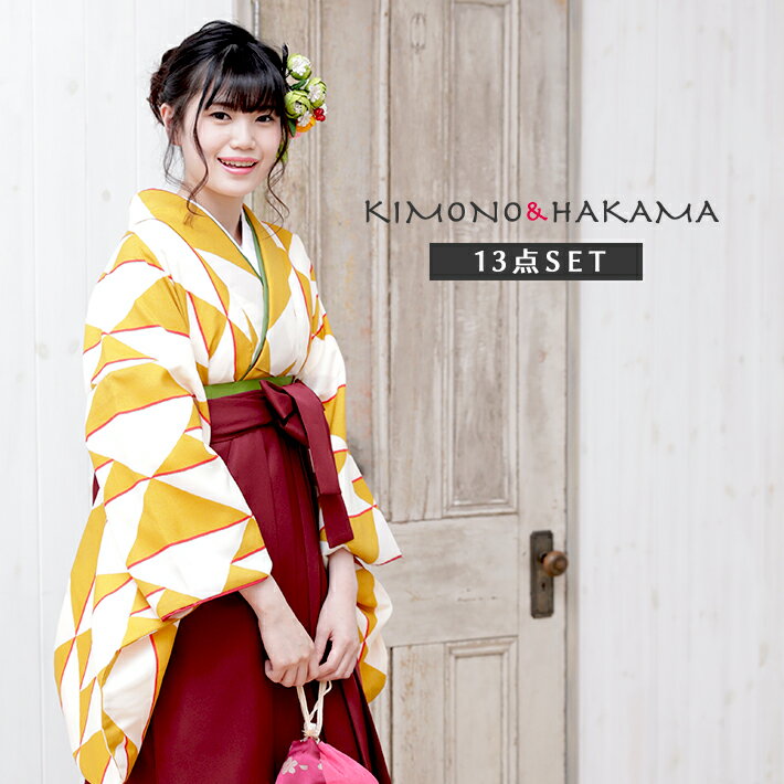 ご確認ください ご予約は、【ご利用日の5日前まで】にお願いいたします。 できる限り実際の商品の色に近づけてはいますが、お使いのブラウザの環境により多少異なることがございます。 ★内容(13点セット) 1. 着物2. 袴3. 半巾帯4. 長襦袢5. 半衿(長襦袢へ縫い付け済)6. 草履7. 巾着8. 重ね衿9. 腰紐×310. コーリンベルト11. 伊達締め12. 衿芯13. 帯板 持ち運びに便利なキルティングバッグに入れてお届けします。 ★サイズの選び方 袴のひだが始まる部分から裾までの長さを「袴丈」と呼びます。「アンダーバストの約5cm下からくるぶしまでの長さ」を目安に、サイズ表の適応身長を記載しております。 草履を合わせる場合は足首が見えすぎないように長めの丈、ブーツを合わせる場合はブーツが見えるように短めの丈、がバランスが良く見えます。草履もブーツも両方履く場合は、5cm程度は着付け... |