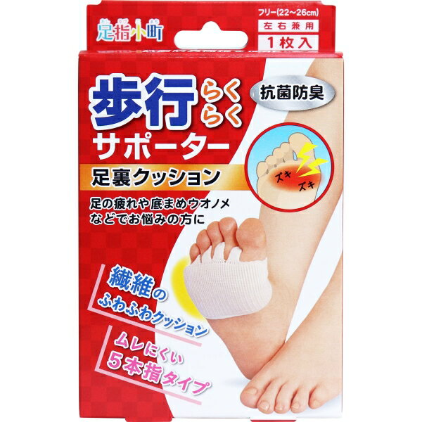 <br>4907706300822|商品区分:フットケア【足指小町 歩行らくらくサポーター 足裏クッションの商品詳細】●足の疲れや底まめウオノメなどでお悩みの方に●繊維のふわふわクッション●ムレにくい五本指タイプ●通気性に優れた抗菌防臭繊維使用【足指小町 歩行らくらくサポーター 足裏クッションの原材料】綿・ナイロン・アクリル・ポリエステル・ポリウレタン【規格概要】フリーサイズ:22-26cm【注意事項】・ご使用前に、この取扱説明欄を必ずお読み下さい。・お読みになった後は保存し、わからないときに再読して下さい。・使用中異常を感じられた時には、直ちに使用を中止して下さい。・乾燥機、アイロン、暖房器具での乾燥はお避け下さい。【原産国】日本【発売元、製造元、輸入元又は販売元】ミノウラ130-0021 東京都墨田区緑1-24-403-3632-6176 |【お買い上げ前にお読みください】※パッケージ... |