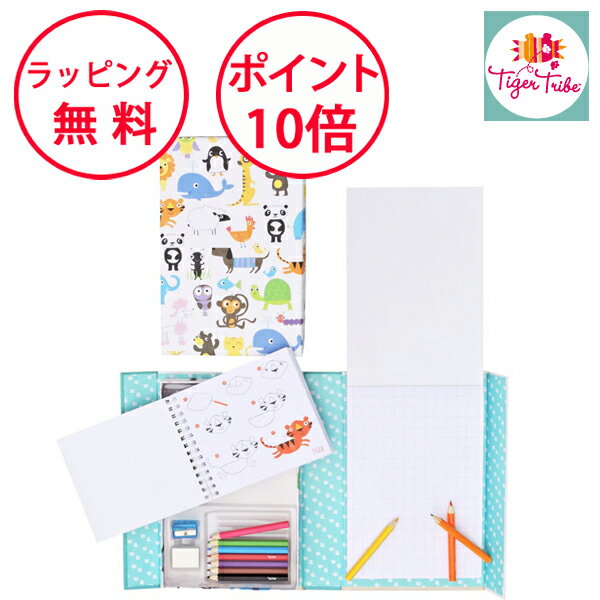 ・セット内容:カバー本体、収納ケース、スケッチ用紙50枚(ケースとスケッチ用紙は一体型です。取外しはできません。)、描き方ブック、鉛筆1本、色鉛筆9本、鉛筆削り、消しゴム ・サイズ:縦24×幅16×厚さ3.8cm ・ケース、シール材質:紙、マグネット ・色鉛筆材質:木、塗料 ・対象年齢:5歳〜 ・メーカー:Tiger Tribe(タイガートライブ) ・原産国:中国Tiger Tribe(タイガートライブ) イラストの描きかたノート 動物 Animals動物のイラストを簡単に描くことが出来るようになる、描き方ブック付のおえかきセットです。難しい色々な28種類の動物を、簡単なカタチの組み合せで描くことができます。描く順番や色塗りのお手本が載っている描き方ブックを見ながら、マス目が描かれたスケッチ用紙に自分で描くことで、オリジナルのかわいいイラストが描けます。一体になったケースに全てしまえるので... |