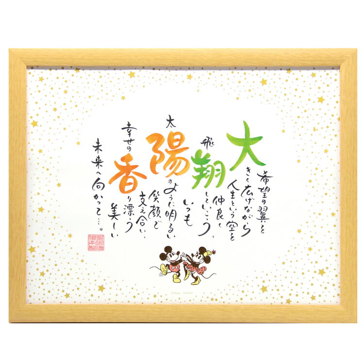 ひとりひとりが持つ、大切な「お名前」から創ったポエムを、ディズニーの仲間が彩るオリジナルアート作品。 散りばめられた星たちの中心に、昔から変わらず愛されるクラシックなオールドミッキー&ミニーがダンスを踊るイラスト付きです。 作家がオーダーに合わせて作るので、世界で1つの贈り物や、結婚式・披露宴のウェルカムスペースに彩りを添えるウェルカムボードとして、また、「ありがとう」では語りつくせない感謝を込めて、ご両親への花束贈呈の代わりにも。 挙式・披露宴後もご自宅に飾って、喜びや感動をいつまでも変わらぬ形で残せる額入りのフレームタイプです。 「一生に一度しかない特別な日を最高の思い出にしたい」 「一味違ったプレゼントを贈りたい」 「名前入りの詩で驚かせたい」 ご結婚祝いなどのウェディング以外にも御結婚記念日やお誕生日、父の日、母の日などの贈り物にされても素敵ですね。 【内容】 ◆お二人のお名前を詩... |