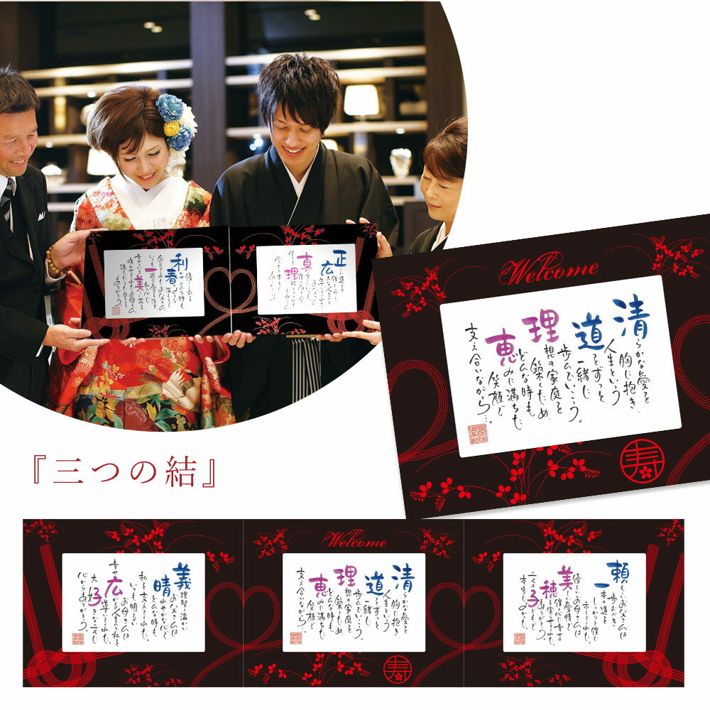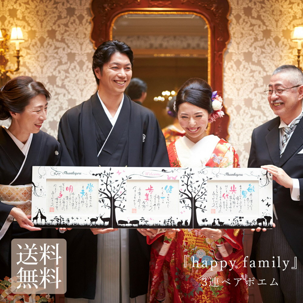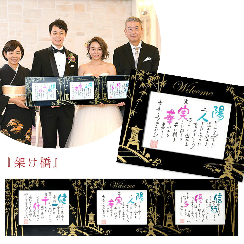 ひとりひとりが持つ、大切な「お名前」を元に創ったポエムを三つ並べれば、一つの絵柄になるアート作品に。 オンリーワンのネームインポエムは、中央の作品に「Welcome」のメッセージ入りなので、結婚式・披露宴のウェルカムスペースに彩りを添えるウェルカムボードとしてご利用いただけます。 また、両隣のポエムは世界で1つの贈り物として「ありがとう」では語りつくせない感謝を込めて、ご両親への花束贈呈の代わりに贈るのにも最適なメモリアルギフトです。 フレームには松や梅と同じく冬の寒さにも耐え、しなやかに真っすぐ伸びることから「長寿」を願う縁起物の竹をあしらいました。さらに、作品がつながることで、三つの家族の絆を繋ぐ架け橋が現れます。 ご両親に贈呈後は、三家族が並ぶことで感動的な演出でシャッターチャンスが訪れます。 素敵な1日の思い出を形にするフレーム作品は、挙式・披露宴後もご自宅に飾って、喜びや感動をい... |