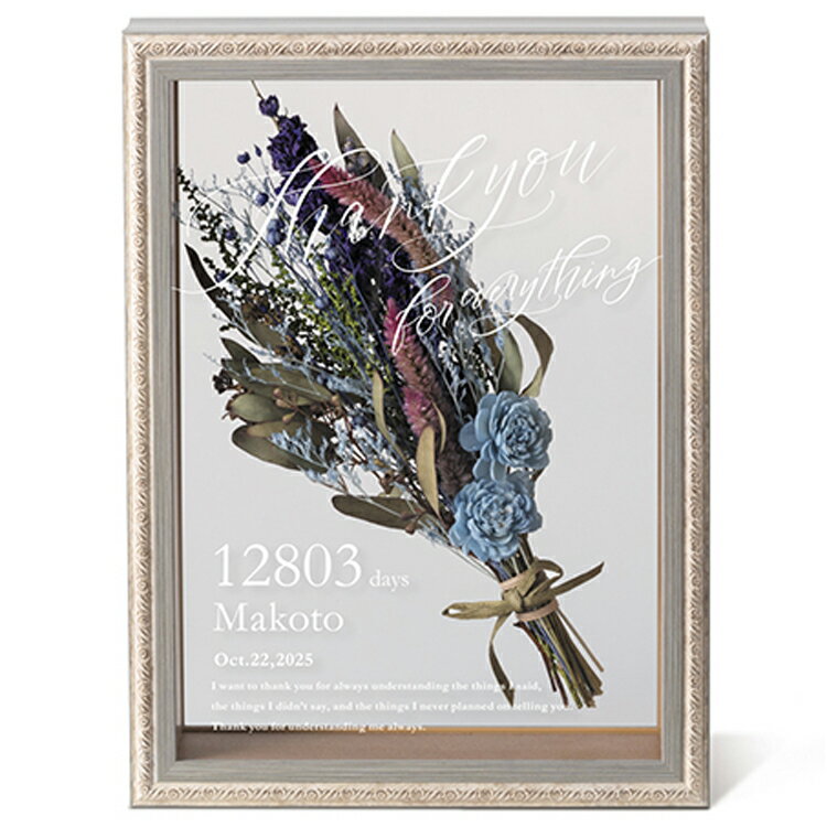 いつまでも色褪せない大切な思い出を、「感謝状」として世界にひとつのアート作品に。 知的で洗練されたブルーベースの花束をアンティーク調のボックスを透明なアクリル板で挟むので、フラワーアレンジメントに存在感と立体感が生まれます。 パネルには、挙式日とお名前、生まれてから結婚するまでの大切な日数を印字します。 人生の門出にぴったりなギフトは、結婚式でご両親への花束贈呈の代わりにも。なかなか普段は口に出して言えない感謝の気持ちを、素敵な贈り物に託しましょう。 挙式・披露宴後もご両親のご自宅に飾って、喜びや感動をいつまでも変わらぬ形で残せます。 【内容】 ●サンキューフレームアート(置きタイプ)×1 ・ブルーフラワーアレンジメント 【材質】 ・ドライフラワー ・アクリル板(UV印刷) ・樹脂製フレーム 【商品サイズ】 約34×26×6.5cm 【印字内容】 ご注文時ご記入下さい。 1.出生年月日 (... |