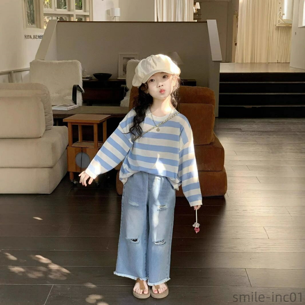 女の子 長袖 tシャツ ロングパンツ 上下セット 2点セット 子供服 ストライプ柄 トップス トレーナー 薄手 ジーンズ デニムズボン ワイドパンツ セットアップ ガールズ スーツ 洋服 普段着 韓国風 可愛い 人気 夏服 旅行 海辺 ビーチ 七五三 通園 通学 ギフト "女の子の活発な春を彩る新作セットを是非チェックしてください!" "【可愛いデザイン】長袖 Tシャツは、ストライプ柄で、日焼け防止機能も備えており、お出かけや遊びの際も安心です。破れデザインのジーンズは、トレンド感あふれるファッション性と抜群の着心地を兼ね備えています。【快適】生地の材質は柔軟で、通気性があり、快適で、自然な垂感があります、合わせやすい子供服です。 柔らかな肌触りと風合いが良いので、キッズにもママにも好まれています。【合わせやすい】セットアップで着ても、上下別々に着ることもでき、コーディネートの幅も広がりま... |