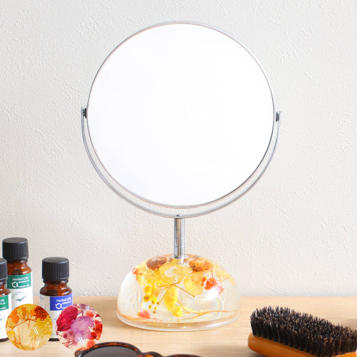 サイズ約 幅16×奥行10×高さ22(cm)ミラー:直径14.5(cm)内容量1台材質本体:2mm厚ミラー(平/拡大鏡 約2倍)、アクリル、ジェリージェル、ドライフラワー、アルミニウム、金属種類オレンジ、ピンク生産国日本製注意事項※天然素材を使用しているためドライフラワーの大きさや色、形などに個体差があります。また、ハンドメイドで花材を配慮し樹脂を流し込んでいるため、気泡が入ったり配置や色など製品ひとつひとつに個体差があります区分返品・キャンセル区分(小型商品)ギフトラッピングページを見るスタンドミラー 片面拡大鏡 2倍率 ショートタイプ ハーバリウムベースおすすめポイント※こちらは2倍率拡大鏡ショートタイプの商品ページです暮らしに彩りを添える優雅なハーバリウムスタンドミラー普段何気なく使う鏡もお部屋のインテリアの一つになる美しいスタンドミラーです。お気に入りのデスクやドレッサーに置いて、... |