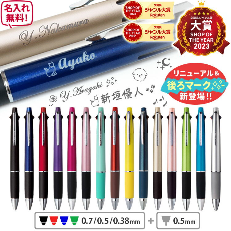 商品名 ジェットストリーム 4&1 多機能ボールペン|三菱鉛筆 MSXE5-1000 0.5mm/0.7mm/0.38mm 商品概要 書き心地抜群のジェットストリーム 4&1なら、黒・赤・青・緑の4色ボールペン+シャープペンが1本に!手帳での色分けやビジネスシーン、学習まで、あらゆる場面で使い分けできます。名入れ対応で、お世話になった方への感謝の気持ちや人生の節目を記念する、心に残るギフトとしても最適です。 主な特長 ✒️ クセになる、なめらかな書き心地新開発インクを搭載した「JETSTREAM」は、従来の油性ボールペンと比べて筆記抵抗が圧倒的に低く、力を入れなくてもスラスラと書けます。速く書いても遅く書いても変わらない心地よさで、長時間の筆記もストレスなく快適。まるで“書くことが楽しくなる”ような筆記体験を叶えます。🖤 くっきり濃く、美しい文字... |