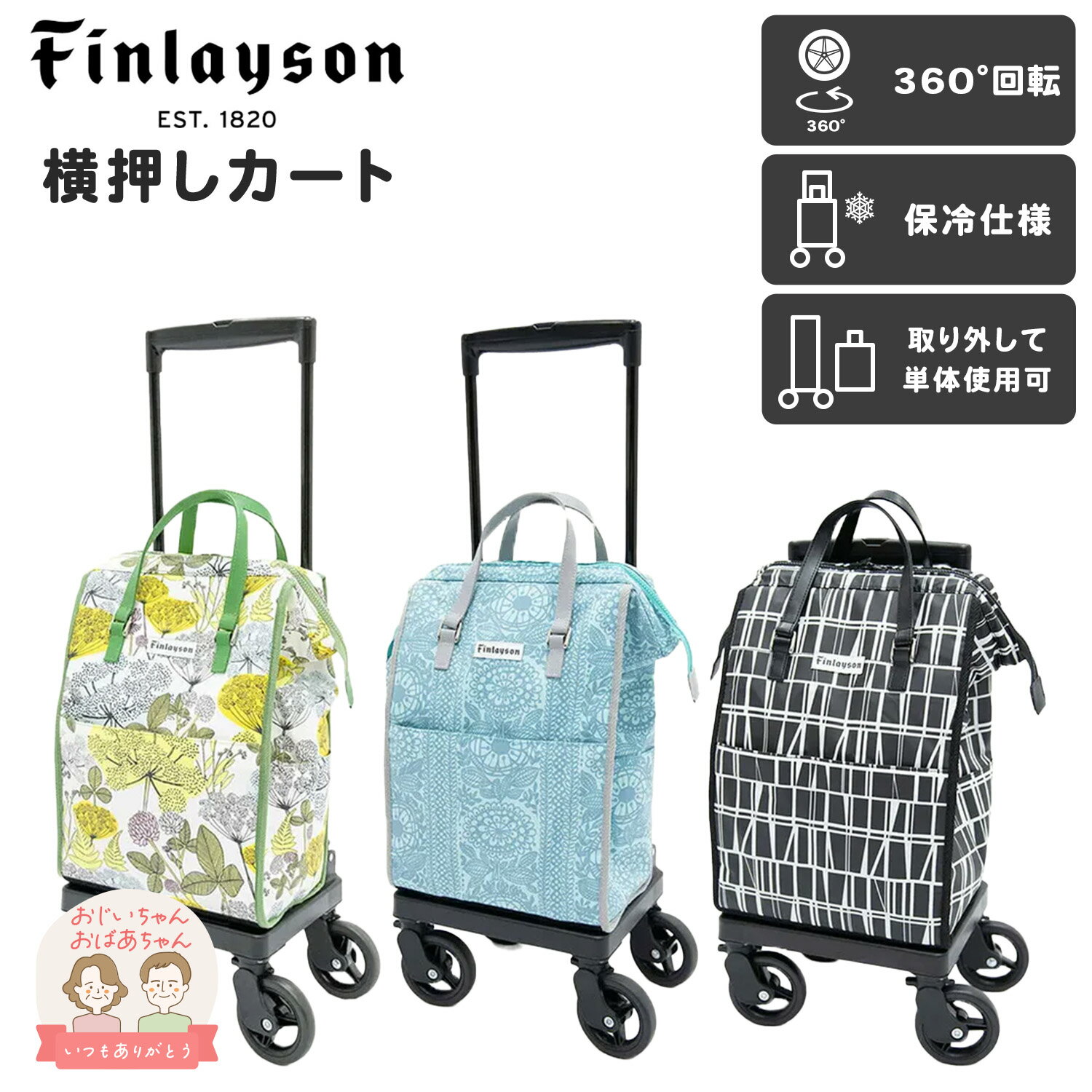 商品説明 ●保冷仕様のバッグ ●バッグが大きく開くので、荷物の出し入れが楽にできます。普段のお買い物やご旅行で活躍できます。 ●身体の横に沿わせて押すタイプ。手元でハンドル部分の調整がワンタッチででき、便利な駐車ストッパー付きです。 ●バッグは取り外して単体で使用できます。 ●4輪キャスターが360度回転するので小回りが利きます。 ●※生産ロットにより色合いが僅かに違う場合がございます。 Finlayson フィンレイソン 1820年に創業された、北欧フィンランド最古のテキスタイルブランド。約200年もの長い歴史と伝統を持つフィンレイソンは、寝装品、ホームテキスタイルを中心とした質の高い商品によって、国内外の人々に最高の住まい方を提供。フィンランド中のどの家庭でも見られるほど、信頼され広く愛用されています。1951年には、フィンランド国内で最も早く自社内にデザインスタジオを設立し、高品質で... |