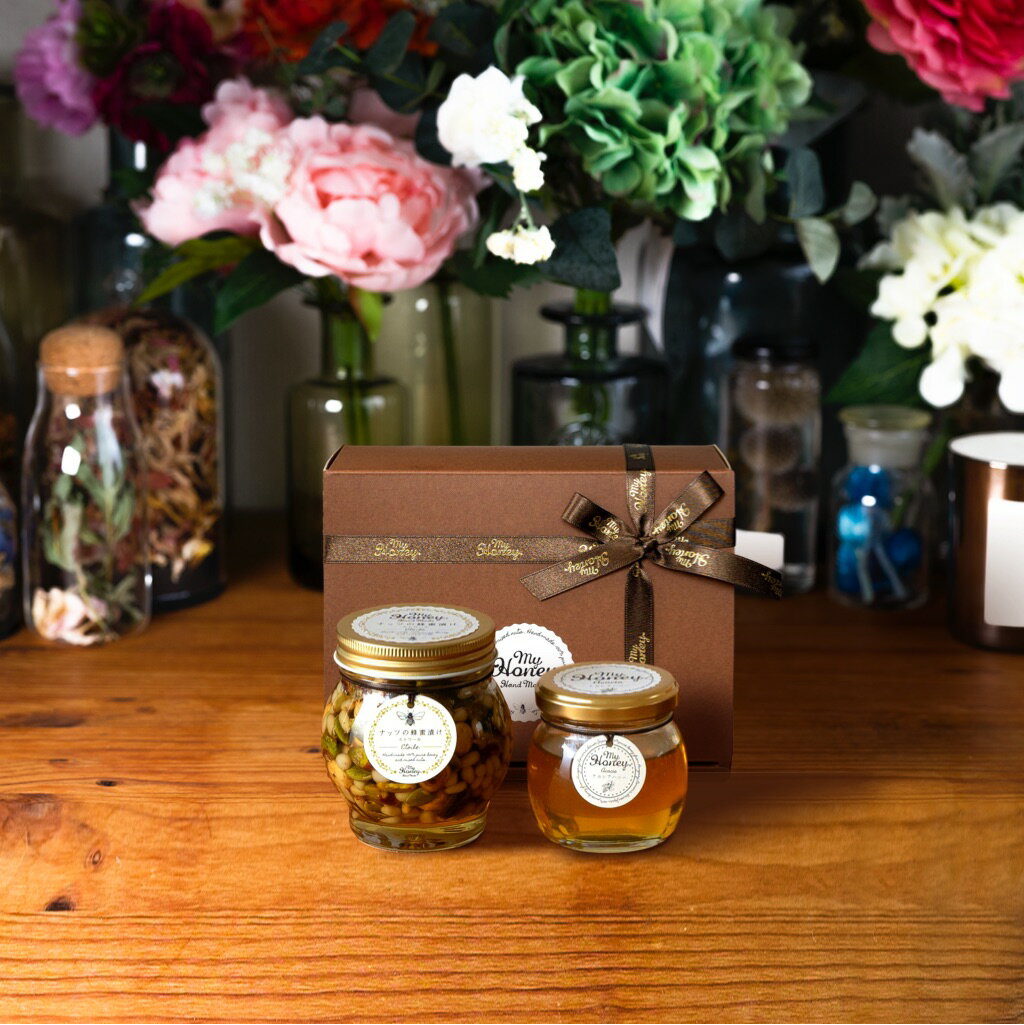 ラッピングブラウンギフトボックス(S) + MYHONEYロゴ入りリボンセット内容ナッツの蜂蜜漬け エトワールL(200g) + アカシアハニーM(90g)原材料ナッツの蜂蜜漬け エトワールL(200g):アカシア蜂蜜(ハンガリー産)、ヘーゼルナッツ、ピスタチオ、アーモンド、パンプキンシード、黒こしょうアカシアハニーM(90g):蜂蜜(ハンガリー産)賞味期限ナッツの蜂蜜漬け エトワールL(200g):製造日より1年6ヶ月アカシアハニーM(90g):製造日より2年保存方法直射日光を避け、常温で保存してください。 配送方法常温 通常配送 製造者株式会社 MY HONEY鳥取県東伯郡北栄町江北508代表 (0120-8383-52) 送料税込770円(北海道1,034円 沖縄990円) 1配送先につき 3,980(税込)以上お買い上げで送料無料こんなキーワードで検索されています御中元 / お中元... |