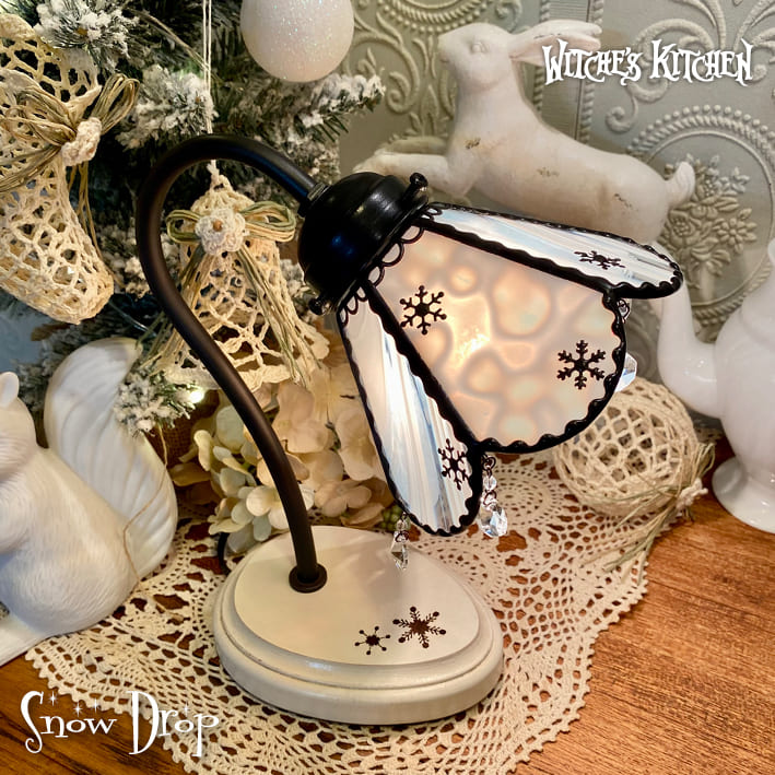 小さなグースネックランプ『スノードロップ』。 雪花を散りばめ装いも新たに スノーカラーコレクションで登場です。 白とマーブルグラス、2種類の白を合わせた 雪の中にそっと開いた可憐な花のようなランプです。 グラスビーズが揺れるシェードにオリジナル木ベースを 合わせた可愛らしいランプ。 ベースには、雪の結晶模様を刻印したスペシャル使用、 ミルクペイント、アンティーク仕上げです。 プレゼントにもおすすめです。 ◆サイズWDH(mm):130×220×235 ◆シェードサイズWDH(mm):130×130×90 ◆コードの長さ約180cm・中間スイッチ付き ◆素材:シェード(ガラス)・スタンドベース(アイアン・パイン材) ◆仕様:E17 40W球 ◆送料ランクA ◆ウィッチーズキッチンの照明は全て作家が作るオリジナルデザイン。 ドイツ、フランス、アメリカ生まれの美しいグラスのみを厳選し、 一点一... |