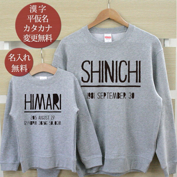 親子でおソロデザインのスウェットトレーナーです。親子それぞれの「お名前」が入ります。セット内容:名入れキッズトレーナー(子供用)1着・名入れトレーナー(大人用)1着★お子様のお名前とデザインが合体★ココロコではデザイナーが文字のバランスを調整して絵柄の中にお名前やお誕生日の文字を入れて一点ずつ専用のデザインを作成しています。ですから仕上がりも奇麗に、まるで自分のブランドのようなオリジナルアイテムを作ることができるんです!セミオーダーメイドで作る一点ものの名入れグッズは★世界でたった一つだけの贈り物★二人目三人目の出産祝いでも他とかぶらないお祝いとして喜ばれています。■ Item Specサイズ110/130/150/S/M/L/XL/XXL(ユニセックス)素材綿100%10.0オンスおもな用途誕生日プレゼント 母の日のプレゼント 父の日のプレゼント バレンタイン パジャマ 部屋着プリント前... |