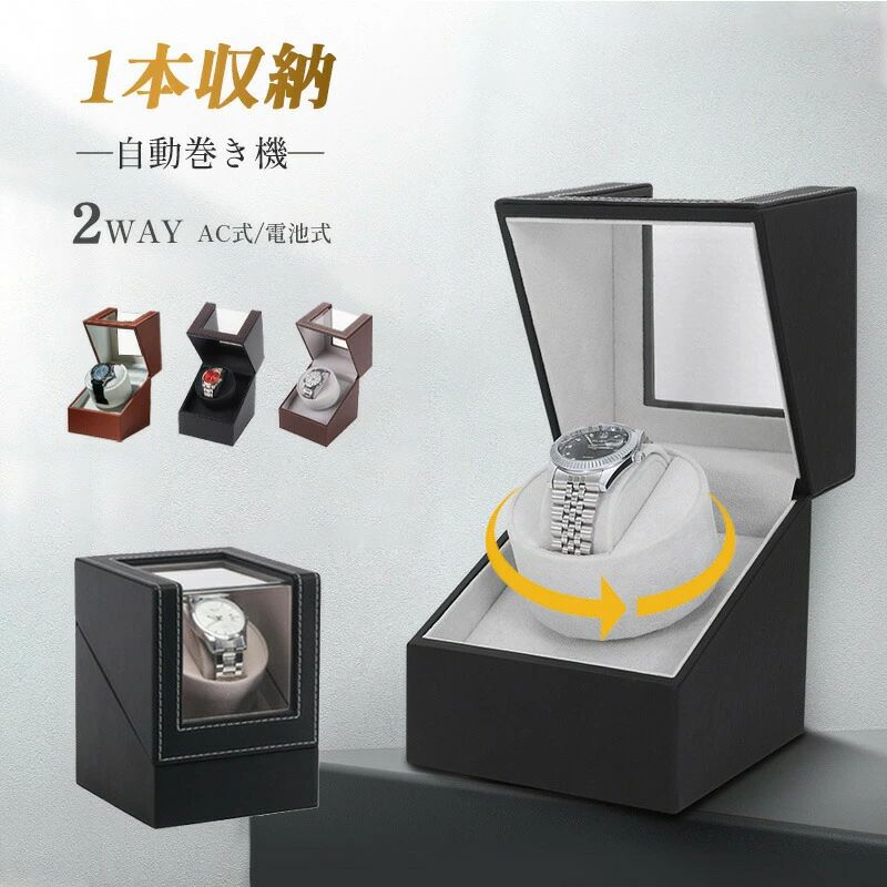 静音設計!自動巻き腕時計 1本巻き用。両方向回転式 ワインディングマシーン。自動巻き腕時計用ワインディングマシーン!自動巻き腕時計全体を回転させることで内部のローターを回転させ、巻き上げを行うアイテムです。長時間使わない状態が続くと歯車など内部の油が凝固し、故障や不調が発生しやすくなるため、自動巻き腕時計をセットし、回転させることでベストな状態を保つことができます。大切なコレクションの腕時計を、末永く使うために欠かせないアイテムです。インテリアにも馴染むレザーのボックス型!お部屋のインテリアにも馴染みやすい上品なレザーのボックス型ワインディングマシーン。自動巻き腕時計だけでなく、お気に入りの腕時計のディスプレイにもおすすめです。寝室にも置ける静音設計!動作音がほぼ無音で、寝室や書斎においても睡眠や作業の邪魔になりません。USB電源式と電池式が選べる2way!置く場所に合わせて選べるUSB電... |
