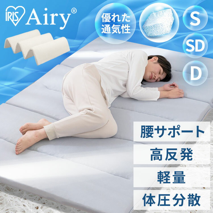 コンパクトに収納できる6つ折りマットレス。多くの方に選ばれているAiry®シリーズ。※「Airy」「エアリー」「エアリーマットレス」はアイリスオーヤマ株式会社の登録商標です。未使用時はコンパクトに収納。かさばらず、扱いやすい。収納ケース付属で持ち運びにも便利。来客用、アウトドアなどにもおすすめです。中材に東洋紡エアロキューブ®を使用。芯材の中身が空洞の中空成形。製品体積の約95%を空気で構成しています。(エアロキューブ®は東洋紡株式会社の登録商標です)優れたクッション性が腰や背中に集中しがちな身体の圧力を上手に分散。身体の沈み込みを支え、理想的な寝姿勢を保ちます。SEK基準「抗菌防臭」と「制菌」をクリア。通気性の高いダブルラッセル生地を使用。厚みがあり立体的でクッション性に優れています。本体はシャワーなどでの水洗いが可能。いつでも清潔を保てます。※カバーは取り外しで... |