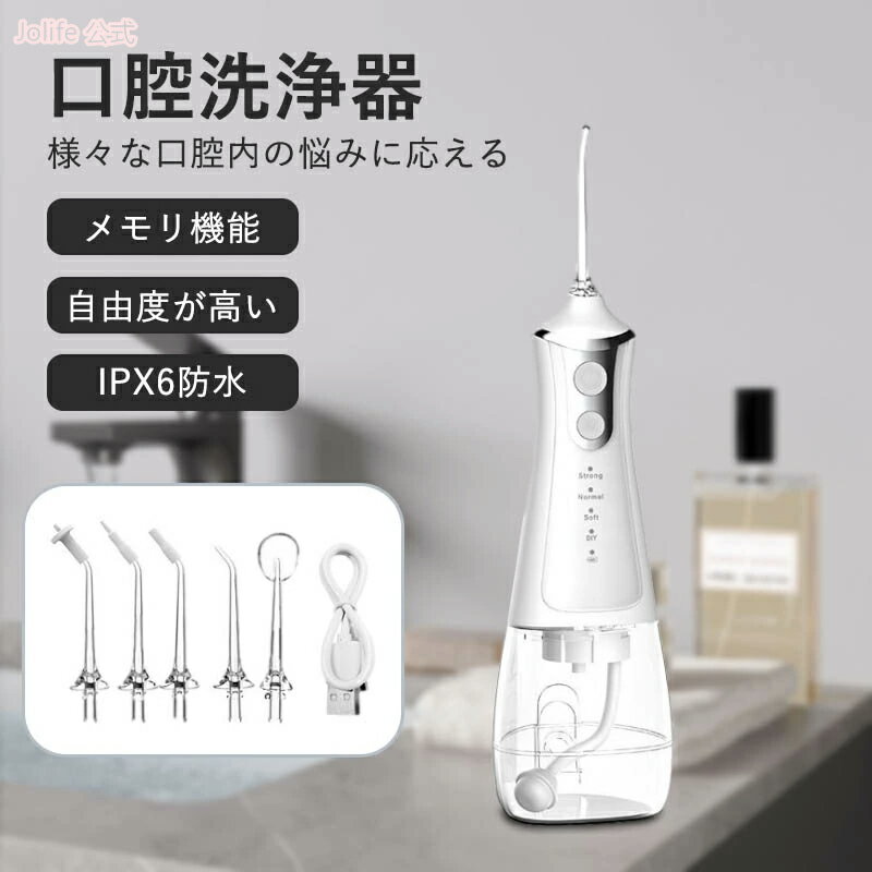 【基本仕様】タイマー:1日2分間 モード:4段階(ノーマル、ソフト、マッサージ、DIY) 容量:300ml 充電:USB充電 充電時間:約3-4時間 電池容量:2000mAh 連続使用期間:約50日間(1日2分使用の場合) パルス周波数:1600-1800回/min 圧力:20〜140psi(psi=空気圧力) 水流:ジェット水流 ノズル回転:360度【セット内容】本体x1、ノズルx4本、給水ホースx1本、取扱説明書、充電ケーブル【操作簡単&4つモード調節可能】口腔洗浄器に操作ボタン3つ+DIYボタンがあります。もう1つはモードボタンで、ローからハイまでとも3段階の水圧モードを選択することができます。【口腔洗浄ノズル4本付き】セットには標準ノズル、歯列矯正器用ノズル、歯周ポケット用ノズル、舌苔洗浄ノズル、4本ノズルが付属されています(歯ブラシのノズル、鼻洗浄ノズルを追加可能)。ジェット水流... |