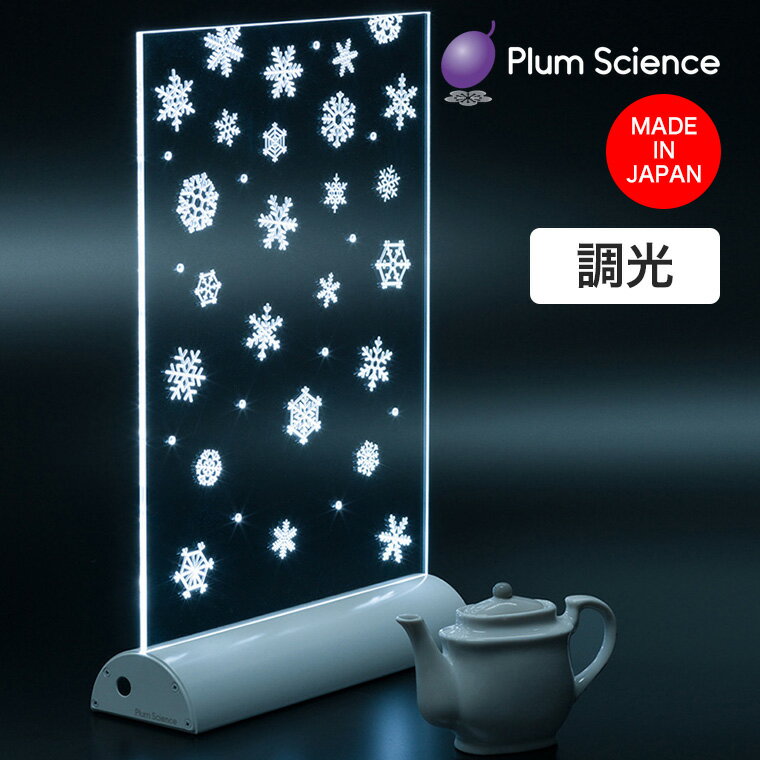 光源:(電球色)LED配列480lm・色温度K5100(昼白色) 調光機能:3段階(100%・55%・10%) 材質:両面ハードコート加工アクリルアルミ台座 サイズ:幅253mm×高さ377mm×奥行80mm 重量:1.04kg 電圧/電流:AC100V50/60Hz(日本用)6W 電源部:透明コード長さ2m 保証:2年間 認証:PSE 生産国:日本 Plum Science (プラムサイエンス) Snowflake Crystal (スノーフレーククリスタル) LEDムードライト 雪の結晶 SF1000-C 壮麗な雪景色を思わせるLEDスタンドライト・Snowflake(スノーフレーク)。 Plum Scienceが拠点を置く北海道の舞い落ちる雪の結晶をモチーフにしたユニークなインテリアライトです。 透明アクリル板の中を通る光が板に空いた溝によって散らされ、宝石のように明るく輝き出します... |