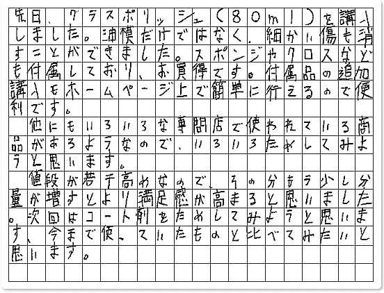 ■ ご使用製品の詳細をチェック! グラスポリッシュ フェルトスポンジ ベーシッククロス茨城県 tee-taka様からご提供いただいております。 先日、グラスポリッシュ(80ml)を購入しました。 油膜だけではなく、細かい傷も消すことができました。 スポンジやクロスなども付属しており、お買得です。 付属品の追加購入もホームページ上で簡単に行えるので便利です。 他にもいろいろな専門店で使われている商品があるようなので、いろいろためしてみようと思います。 値段が若干高めなので、その分もう少し分量が増すとより満足感が高まると思いました。 次回はコート剤をためしてみようと思います、今まで使っていたものと比べてみたいと思います... |