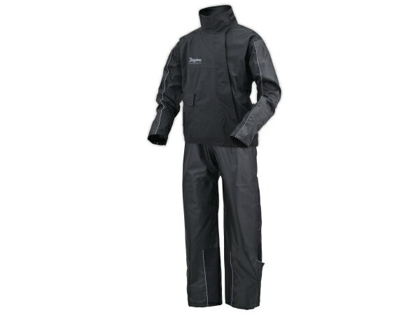 【品名】 DR-001 ハイパフォーマンスレインウエア 上下セット ブラック 【品番】 48216 【仕様】 カラー:ブラック サイズ:BL ライダーが濡れないことを最優先に考えた、バイク用 防水・透湿 高性能レインウェア ジャケットは、動きやすいストレッチ生地を使用し、斜めに配置したフロントフラップがファスナーからの浸水を防止。首元には内側がクロロプレン素材の高い襟を採用し、袖口は二重袖とサムホール、裾は二重裾とドローコードで雨滴の侵入を防ぎます。背中のベンチレーションがムレを防ぎ、バタツキを防ぐ幅広の面ファスナーはグローブでも使いやすい設計です。パンツは、摩耗に強いPVCコート生地を使用し、裾はロングブーツでも履きやすい幅広の面ファスナー仕様。熱に強い綿生地のマフラーガードも装備しています。腕とひざには厚手の生地を使うことで雨滴による痛みを軽減。雨天時の視認性を高める反射パイピングも装... |
