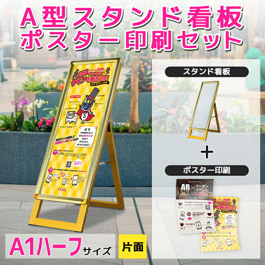 商品名A型グリップスタンド ゴールド ポスター印刷セットポスターサイズA1ハーフ サイズ( W297mm×H841mm )看板の外寸W351mmxH1160mmxD480mm※収納時 H1200mm仕様片面カラーバリエーションゴールド素材アルミニウムアルミ複合板3mm PET1mmアルミフレーム20mm×40mm重量2.8kgポスター交換可ポスター交換方法四辺開閉式付属品スタンド本体 ポスターポスターについて合成紙 / UV印刷(ラミネート加工あり) ■ご利用されているシチュエーション 病院 クリニック 塾 スクール 英会話教室 教育施設 飲食店 カフェ 居酒屋 レストラン スナック カーディーラー カラオケ サロン ネイルサロン ヘアサロン 美容室 市役所 説明会 サービスエリア ショッピングモール 百貨店 映画館 フィットネスクラブ フードコート アパレル スーパー ホテル 雑貨屋 リ... |