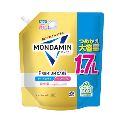 透明/1.7L/-・Size:1.7L・パッケージ個数:1・オールインワンで口内トラブルまるごとケア。しっかり洗浄できるマウスウォッシュ(洗口液)。・たっぷり使える大容量詰替えタイプ・効能・効果むし歯の発生及び進行の予防、歯肉炎予防、出血予防、歯垢付着予防、口臭予防、口中浄化、口中爽快・刺激の強さ微刺激タイプ(刺激度目安:0.5/5段階中)ノンアルコールタイプ・香味やさしいホワイトミントの香味 内容量1700mL商品紹介 ●お口年齢をケアするモンダミン ●「モンダミンプレミアムケアホワイトミント」のつめかえ大容量1.7L ●微刺激タイプ(刺激度目安:0.5/5段階中) 口内環境まるごと徹底ケア ・口臭予防、むし歯の発生及び進行の予防、出血予防、歯肉炎予防、歯垢付着予防、口中浄化、口中爽快 ・長時間殺菌コート、クーリング成分配合(香料中) ●ホワイトミント味 ●ノンアルコール ・Act Fo... |