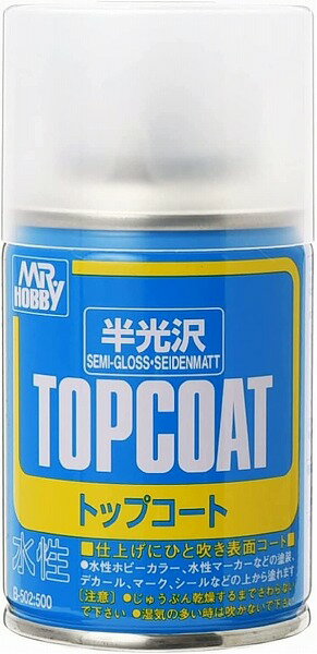 GSIクレオス 「Mr.トップコート 半光沢 水性スプレー 88ml」 模型用仕上材です。 表面仕上げ用コート剤です。 塗装したモデルの最終仕上げに、さっとひと吹きするだけで効果を発揮します。 水性ですから、スライドマーク(デカール)の上から塗ってもスライドマークを傷めず、塗装面とスライドマークのつやの差・段差を解消します。 水性ホビーカラーで塗装したモデルの表面保護にも最適です。 半光沢は飛行機モデルやフィギュア、キャラクターモデル向けといえます。 特に軍用機はマーキングが多いので、塗装面とスライドマークの段差を目立たないようにするのによいでしょう。 ※スライドマークの上から塗るとき、スライドマークの種類によっては表面が溶ける場合もありますので、必ず試し吹きをして確認をしてください。 ※湿度の高い時には吹き付けないでください。 表面が白くにごることがあります。 容量:88m... |