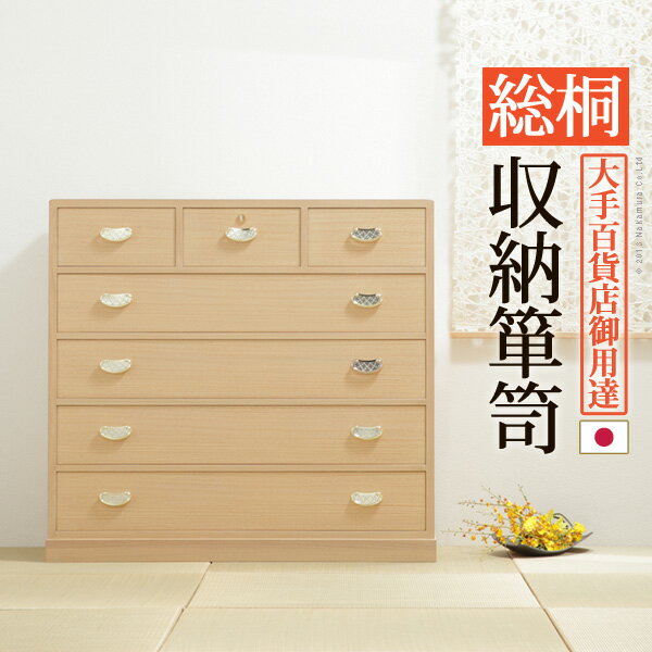 | 引出し10段の総桐着物箪笥。18mm厚の天然木をふんだんに使用した贅沢なつくり。板が厚いと狂いも少なくなりますので、長くお使いいただけます。引出しはしっかりしたつくりの「留め加工」を用い、金釘を使用しておりません。また、引出しの横には溝がありますので、持ち運びの際に持ち手になり便利です。取っ手の金具には縁起が良いとされる七宝をあしらいました。たとう紙が入る大きさですので着物の収納に最適。匠による伝統の技で、堅牢に美しく仕上げたこだわりの桐タンスです。サイズ(cm):幅99x奥行45.5x高さ84.5cm・約30kg引出し内寸-幅91x奥行40x高さ5.5cm材質:本体-天然木(桐)・字造り・との粉ロウ引き仕上げ、金具-亜鉛合金(黒色)完成品お部屋のテイストに合わせた家具選びラグジュアリー カジュアル 北欧 ノルディック 西海岸 グランジ なかっこいい系テイストや レトロ フェミニン ヴィン... |