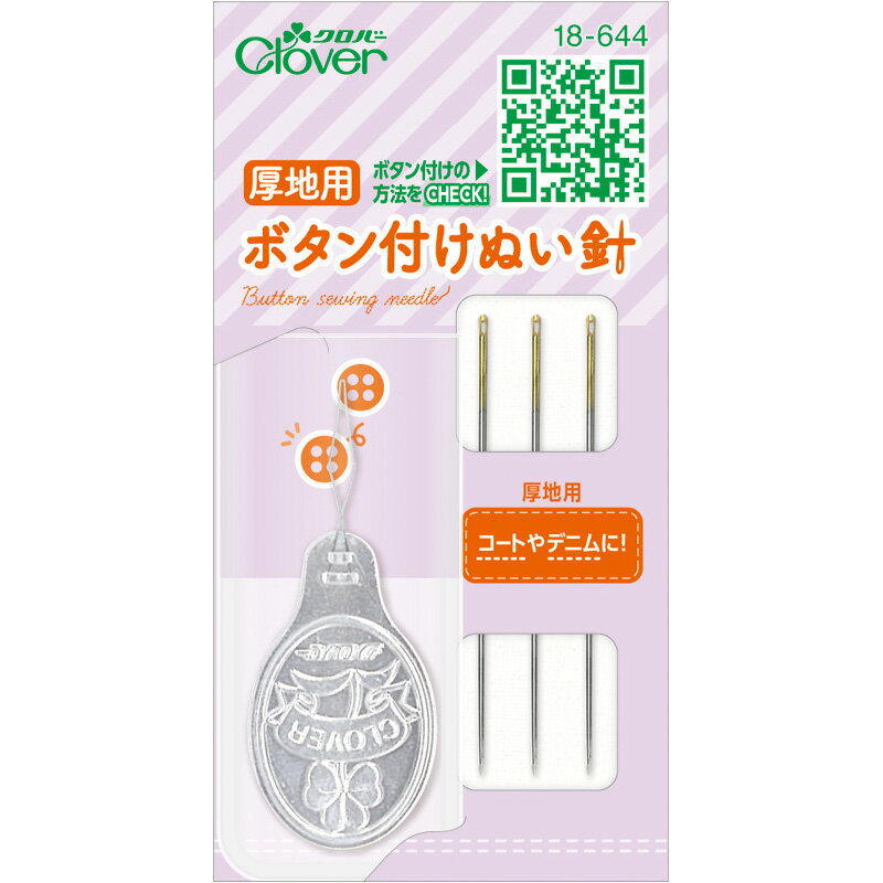 手縫い針 『ボタン付けぬい針 厚地用 18-644』 Clover クロバー コートなどの厚地のボタン付けに! コートやデニムなどの厚地用のボタン付けぬい針と、糸通しのセットです。 商品パッケージのQRコードを読み取って補修方法の動画や写真を見ることができるので、ボタン付けをしたことのない方も安心です。 [手芸道具 手芸用品 ソーイング] ◆パッケージサイズ(約):50×88×4mm ◆セット内容: ボタン付けぬい針:3本(厚地用) 糸通し:1枚 収納ケース:1個 ◆材質: 針:鋼(ニッケルメッキ) 糸通し:[本体]アルミニウム [線材]ステンレス鋼 収納ケース:オレフィン系樹脂 ◆日本製 ※特価と表記のある商品は、全てのお客様にお値打ちとなる価格に設定しております為、割引対象外となります。 ※モニターによって実物のお色と若干異なる場合がございます。 【手芸用品・毛糸・生地の専門店 ユザワ... |