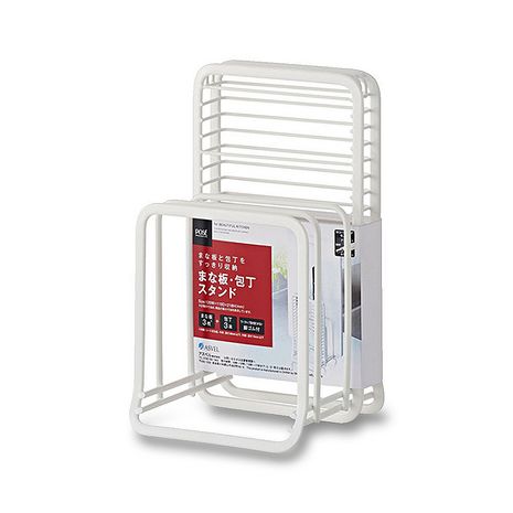 まな板と包丁をまとめて収納 !すっきり一括収納!まな板・包丁スタンド。カッティングシート×1枚、薄手のまな板×1枚、厚手のまな板×1枚、包丁×3本をまとめて収納できます。ダブルコーティングで衛生的に保てます。ワークトップ面をキズ付けない脚ゴム付き。対応サイズ:まな板(厚さ)/5mm以下、2cm以下、3cm以下×各1枚サイズ(約):12×11.9×高さ21.8cm材質:本体/鉄(樹脂コーティング) 脚ゴム/シリコーンゴム付属品:脚ゴム4個中国... |