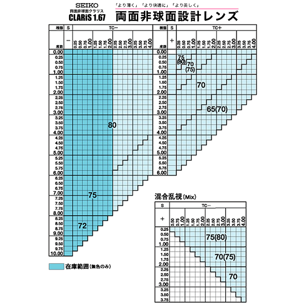 基本仕様 プラスチック 両面非球面 素材 屈折率:1.60 コーティング SFTコート (キズがつきにくいコート標準装備) UVカット UVカット400 在庫範囲 赤くハイライトしてあるところが、メーカー在庫範囲になります。 特注範囲 それ以外はすべて特注になります... |