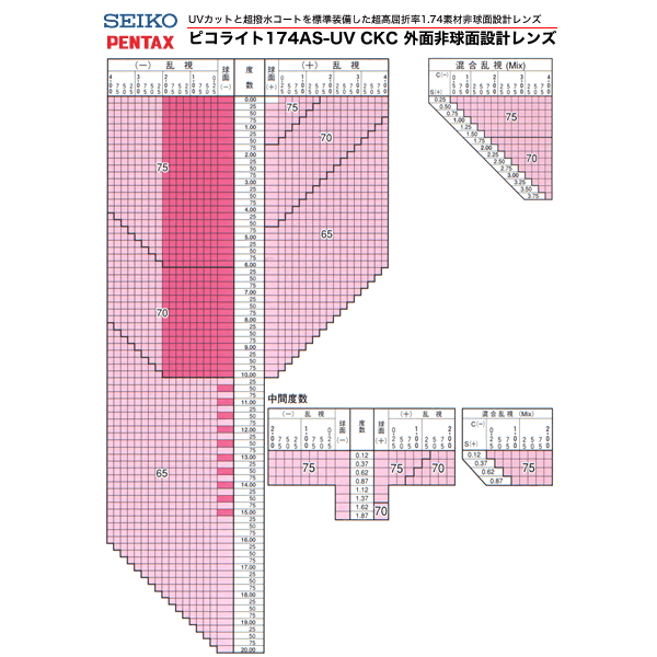 ="435" border="0" cellspacing="2" cellpadding="5"> 最薄型1.74非球面レンズ 度数が強い方に 使用レンズ SEIKO UP1.74AS 素材 プラスチック 屈折率 1.74 コート フォグレスコート UVカット UV400標準 レンズは非球面設計ですのでカーブの強いフレームには対応いたしておりません。 別作となりますので、発送まで一週間ほどかかります。 フチなしメガネには対応しておりません。1.67のレンズをご使用ください。 ご使用中のメガネのレンズの交換も承ります... |