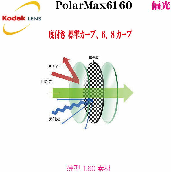 ※全て特注となります。(納期10日前後) 1.60薄型度付き偏光プラスチック ツーポイント(縁なし)にも使用可能 レンズカラー:19色 ミラーカラー:5色 レンズコート:ハードコート ハードマルチコート¥4,400加算 内面ハードマルチコート¥4,400加算 プラチナAR(ミラー)コート¥11,000加算 レンズカーブ:標準カーブ(度数によりカーブが変わります)、2、4、6、8カーブ ナイロール加工には適しません。 偏光度:99% UVカット標準装備 ※フレーム持込みの場合は下記加工料を合わせてご購入下さい。 フレーム持込加工料 オプションを選択の場合は後程価格を訂正してご連絡差し上げます。Kodak コダック 偏光レンズ PolarMax6160-2 薄型1.60度付き 標準カーブ、2、4、6、8カーブ 偏光レンズの仕組み プラチナAR (フラッ... |