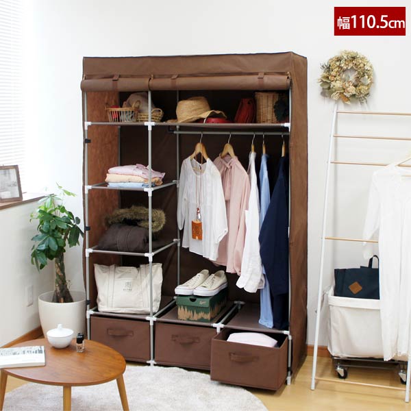製品仕様(組立品) カラー ブラウン サイズ(約) 幅110.5×奥行45×高さ166.5cm 重量(約) 5.2kg 梱包サイズ(約) 幅36.5×奥行75×高さ11.5cm/6.1kg 材質 本体/スチール・粉体塗装 カバー・棚・引出し/不織布 ジョイント/樹脂 耐荷重 ハンガーパイプ/約10kg 引出し/約2kg(1杯あたり) 棚布/約2kg(1枚あたり) JANコード 4952334023681 生産国 中国掛けて・置いて・入れて収納できるカバー付きラック 引出し付きハンガー カバー付き 幅110.5cm 大切な衣類を清潔に保管できるラック 洋服に合わせて「掛けて」「置いて」「入れて」ができる収納ラック。ハンガーパイプの高さは約97.5cmあるので、スーツやワンピース等丈の長い衣類も収納できます。棚部分には畳んだ衣類・帽子、鞄などを置くのにピッタリ。お手持ちの収納ボックスを置く事も... |