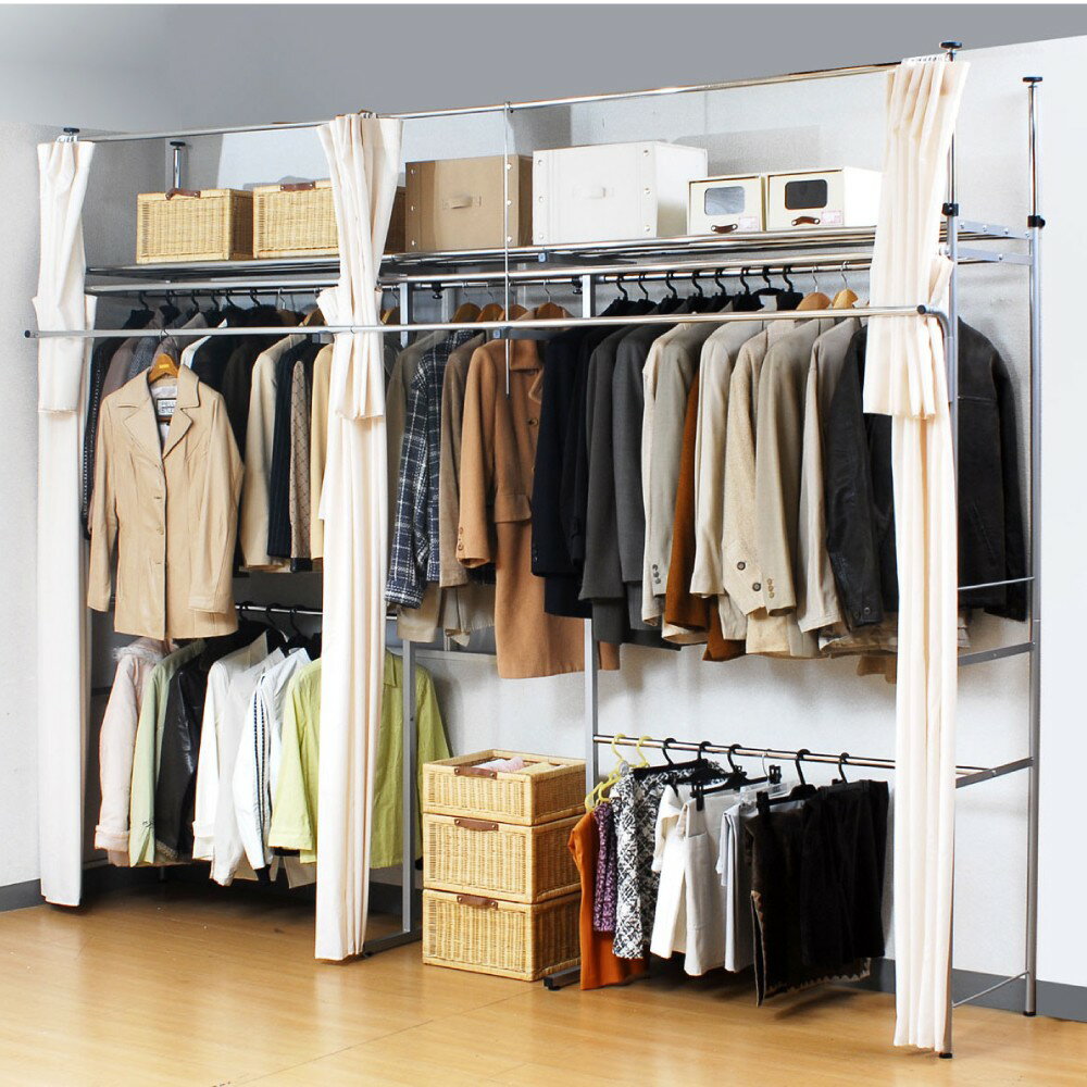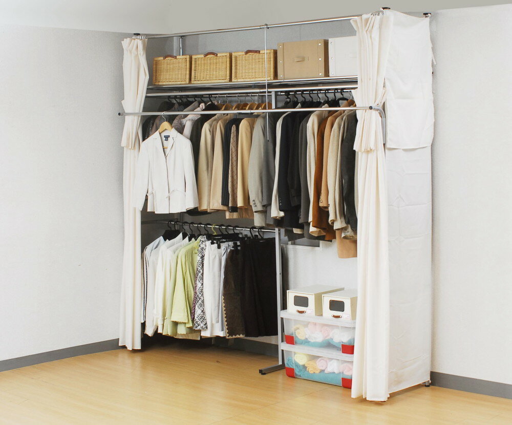 ●縦にも横にも伸縮するので設置場所を選びません。 天井面の突っ張りパイプは前後それぞれ別に伸縮するので、下がり天井(梁)など、前後に段差があってもしっかり設置出来て安全です。 さらに複雑な天井構造では、カーテンレールパイプを取り外す事で対応できます。 ●脱いだ服に風を通せるフロントハンガー付き。 ●カーテンを閉じた状態でもかけられるので、ちょっと掛けに便利です。 ●衣類はもちろん、上段の棚にはケース類やバッグ等、天井いっぱいまで空きを残さずたっぷり収納出来ます。 ●上下左右伸縮自在な、2段式カーテン付なのでホコリを寄せ付けず壁面スッキリ目隠収納。 ●カーテンは取り外し簡単、洗濯機で丸洗いOK! 乾きの早いポリエステル製。 ●前面カーテンはお好みのカーテンに付け替えて、お部屋に合わせて楽しめます。 ●別売りサイドカーテンを取付ければ、サイドからのホコリを防ぎ、お部屋の中に置いても、見た目がす... |