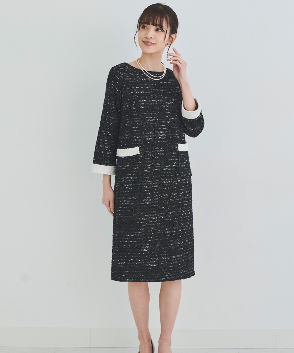 [型番:df0076r]■バイカラーツイードワンピース煌めきツイードの生地とコントラスト配色のパイピングが上品な印象のレディースワンピーススーツ。ツイードに織り込まれたゴールドのテープヤーンの煌めきが華やかなワンピースは、フォーマルスタイル・お出かけスタイル・セレモニースタイルにぴったり。お出かけシーンでは洗練された上品な印象になり、入学式(入園式)や卒業式(卒園式)などの特別な行事にも着回しやすいのが嬉しい。シンプルなデザインなので、ジャケットやコート、お手持ちのアクセサリーと合わせてコーディネートを楽しめるアイテムです。【Color variation】・White・Black・Navy【Point】コントラスト配色のパイピングが目を惹くワンピース!シンプルなネックラインでどんなネックレスも合わせやすいのが嬉しい。後ろはコンシールファスナー開きでスムーズな脱着が可能です。ちょっとしたも... |