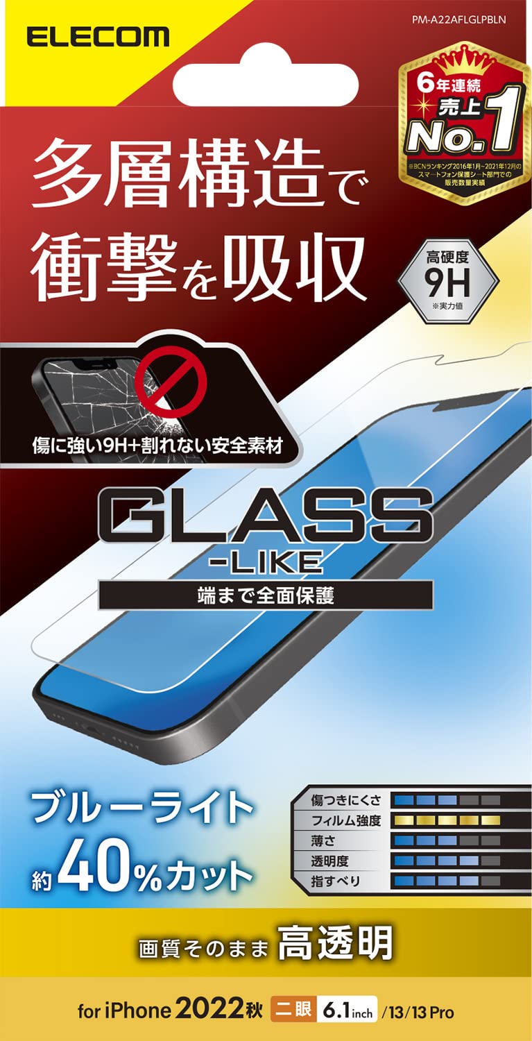 | ガラスのように美しい透明感を実現!割れに強く、ガラスと同じ高硬度9Hの衝撃吸収、ブルーライトカットタイプのiPhone 14、iPhone 13、iPhone 13 Pro用液晶保護フィルムです。 表面硬度9Hのハードコート加工により、フィルム表面の傷を防止します。 ※表面硬度は実力値です。 つやのある高透明タイプで、液晶画面を鮮やかに彩ります。 液晶ディスプレイが発する光の中の青い部分「ブルーライト」を約40%カットします。 ※ブルーライトは目の角膜や水晶体で吸収されずに網膜まで到達し、網膜の機能低下を引き起こす場合があると言われています... |
