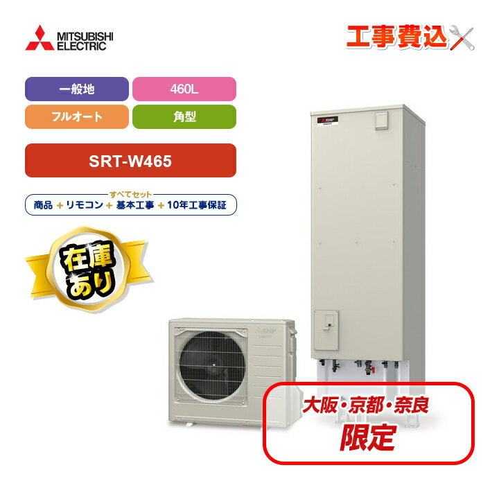 ★1台のみ在庫あり!大阪・奈良・京都限定! ※大阪・奈良・京都以外の方のご注文はご遠慮下さい。 申し訳ございませんが、上記以外の方からのご注文はキャンセルさせて頂きますのでご了承下さい。 三菱エコキュート 工事費込 角型 460L フルオート SRT-W465+リモコン付き 一般地 レビュープレゼント企画!基本工事費コミでおトク! Aシリーズ SRT-W465 460L 角型 フルオート 一般地仕様 本体カラー:モダングレー インターホンリモコン:RMCB-D5SE 脚部カバー:GT-L460A 貯水寸法:2160×630×760mm ヒートポンプ寸法:715×800(+65)×285(+16)mm あったかリンク お天気リンクEZ/AI 三菱HEMS フルオートW追いだき 自動お湯はり 自動保温・自動たし湯 追いだき・急速追いだきv わき上げモード(多め・おまかせ) 学習機能(過去2週... |