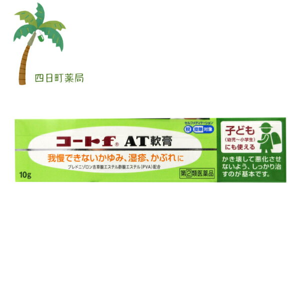 | 【送料無料のお得な2個セットもございます。】 添付文書の内容 商品説明文 湿疹・皮膚炎は異物の刺激やアレルギー反応などによって皮膚が炎症を起こし,多くの場合,患部が赤くはれ,ブツブツができ,かゆみを伴います。コートf AT軟膏は,このような症状の元である「炎症」を穏やかに抑える外用ステロイド・プレドニゾロン吉草酸エステル酢酸エステル(PVA)を配合しています。皮膚のバリア機能が未成熟な子どもの湿疹・皮膚炎にもお使いいただける軟膏タイプの外用剤です。 効能・効果 湿疹,皮膚炎,かぶれ,かゆみ,虫さされ,あせも,じんましん 用法・用量 1日数回,適量を患部に塗布してください。 有効成分・分量 1g中 成分 分量 プレドニゾロン吉草酸エステル酢酸エステル 1.5mg リドカイン 10mg q イソプロピルメチルフェノール 1mg トコフェロール酢酸エステル 5mg 添加物 ミリスチン酸イソプロピ... |