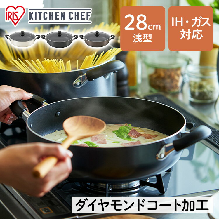 ダイヤモンドコート両手なべ、28cm浅型/IH・ガス対応。【日常に寄り添う、使いやすい鍋】なべ料理など、食卓で楽しむメニューにぴったりな浅型タイプ。土鍋に比べ軽量で、こげつきにくいのも魅力です。(なべ料理約4人分)【ダイヤモンドコーティングで、こびりつきにくい】丈夫で長持ち!!耐摩耗性試験約“50万回(※)”クリア。(※JIS S 2010 7.4.5耐摩耗性試験を参考にした、弊社測定不法にて行った試験より。)人工ダイヤモンドを細かい粒子にして、フッ素加工樹脂に配合。摩耗に強く、コーティングが剥がれにくいから、ソースやスープはするっとキレイに注げます。汚れもするっと落ちるので、洗い物が簡単に。洗剤の量も少なく、エコ&経済的。落ち着いた色合いで、キッチンに置いた時もスタイリッシュに。毎日のお料理をもっと楽しく。●商品サイズ(cm)幅約41×奥行約28.5×高さ約10(なべ本体)●質量約1.5... |