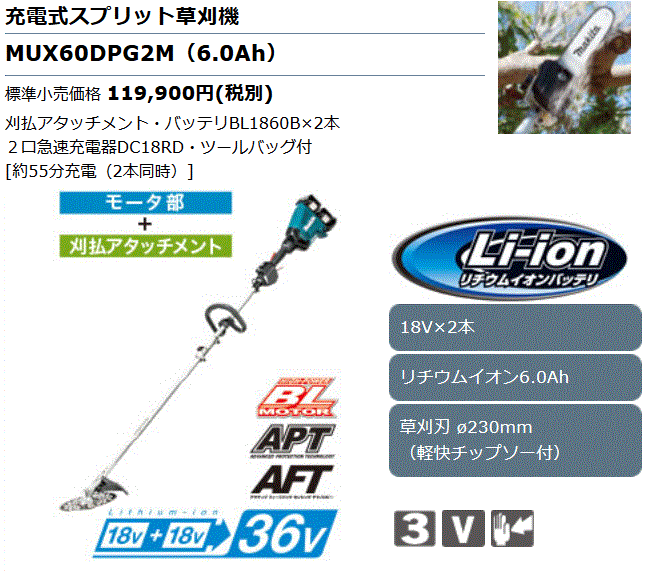 【セット内容】 刈払アタッチメント・バッテリBL1860B×2本 2口急速充電器DC18RD・ツールバッグ付 特長 キックバック時に刃物がストップ ※ 障害物に不意に当たった時に生じる跳ね返り。 注意:本機能はキックバックそのものを防止するものではありません。 ボタン3段変速+ 無段変速トリガスイッチ アタッチメントや作業環境に応じた回転数、作業量を 簡単にコントロール可能。 カラミトリ機能付 スイッチ操作で低速逆回転。 1.5秒後自動停止、正回転へ自動復帰。 持ち運びもスプリットだからラクラク 分割できるから車にもサッと積めて持ち運びラクラク... |