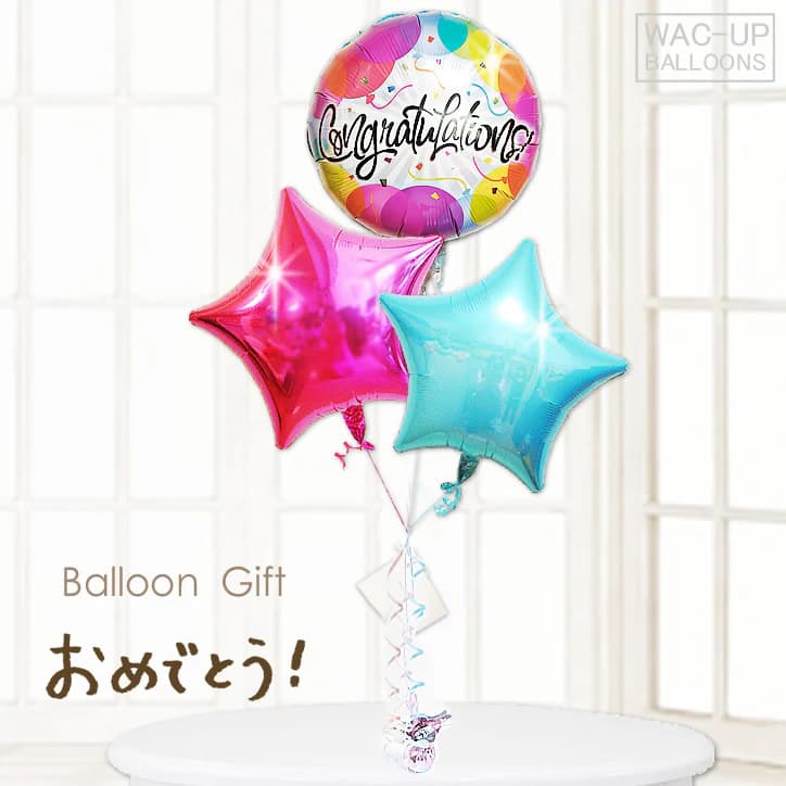 -------------------------------------------------- 「Congratulations!おめでとうバルーン 1個」 「星型バルーン 2個」 -------------------------------------------------- の3点を可愛くアレンジ♪ 一味ちがうお祝いをお考えの方、サプライズして喜ばせたい方におすすめです。 輝くカラフルなバルーンは、光にあたると反射してキラキラと輝くプリズム加工が施され虹のようなカラーリングがパッと目を引きます。 それに2色の星型バルーンでアレンジした、キラキラ眩いバルーン電報ギフトです☆ 誕生日や発表会などのほか、卒園式,ギフト,卒園祝い,入園祝,入園祝い,入園式,幼稚園,保育園,開店祝い,開院祝い,設立記念,新築祝い,栄転,退職祝い,就職祝い,成人祝い,入学祝い,卒業祝い,合格祝い,結婚式... |