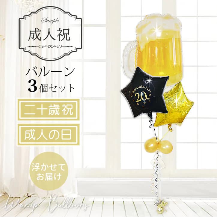 一生に一度の成人式や20歳のお祝いに特別なバルーンサプライズで感動のプレゼントを! 人生で一度きりの特別な瞬間、成人式のお祝いや20歳の誕生日。 そんな記念すべき日を、心に残るサプライズでさらに輝かせませんか? ふわふわ浮かぶ華やかなバルーンギフトセットが、大切な節目を迎えた方に喜びと感動を届けます。 【『Congratulations! 20th』の特別感】 バルーンには、「Congratulations! 20th」とゴールド文字で描かれた黒地のデザインを採用。 成人式や20歳の節目にふさわしい高級感あふれる仕上がりで、贈る方の祝福の気持ちをしっかり伝えます。 さらに、大きなビールデザインのバルーンが加わり、大人の仲間入りをお祝いする楽しいアクセントに。 【開けた瞬間、感動が広がるサプライズ】 大きなギフトボックスを開けると、ふわっと浮かび上がる5つのバルーンブーケ。 その瞬間、驚きと... |