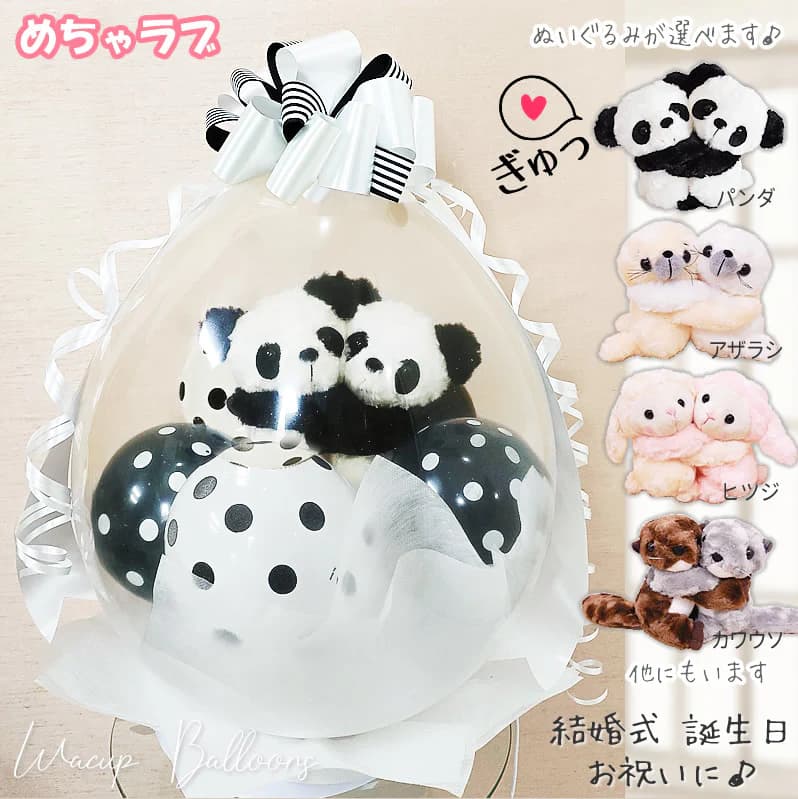 動物好きな方へのプレゼント♪可愛い動物ぬいぐるみ &バルーンギフトセット クマ、パンダ、ペンギン、カピパラ、レッサーパンダ、さる、ブタ、ヒツジ、カワウソ、アザラシ、イルカ からお好きな動物ぬいぐるみが選べます♪ メッセージカード付きなのでしっかりとお祝いの気持ちを表してくれますよ♪ 可愛い動物のぬいぐるみたちがバルーンの中に入ったちょっと面白くて話題たっぷりなバルーンラッピング。 ぬいぐるみと一緒に、ミニ風船がコロコロ入ってかわいい♪ 全体を白×黒でのモノトーンでアレンジ♪ 大人も楽しめるおしゃれな雰囲気にしました。 トップには大きくて立体的なリボン付きでギフト感たっぷり♪ストライプがポイントでスパイシーな感じに。 ぬいぐるみは手のひらサイズで、小動物的かわいさたっぷりです。 動物が好きなお子様、大人、お母さん、おばあちゃん、お父さん、おじいちゃん、動物病院やペットショップなどの開院祝い、... |
