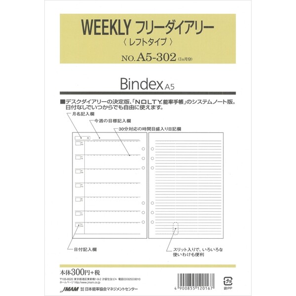 【ご注意】 こちらのページは << A5サイズ 210×148mm >> のご注文ページです。サイズのお間違えにご注意ください。 ■ WEEKLY フリーダイアリー(レフトタイプ)【A5-302】3ヶ月分■ デスクダイアリーの決定版、「NOLTY 能率手帳」のシステムノート版。 日付なしでいつからでも自由に使えます。 時間目盛りは8:00〜24:00。 30分対応の時間目盛入り日記欄 スリット入りで、いろいろな使い分けも便利です。 14週間分が1セットです。3ヶ月分。 サイズ:210×148mm枚数:14週間分が1セットです。3ヶ月分 JANコード 4900855120167 ※Bindex(バインデックス)ブランドのリニューアルに伴い、 商品ページ上で表示している商品パッケージと実際の商品のパッケージが異なる場合がございます。 商品の中身自体に変更はございません。 何卒ご了承いただきます... |