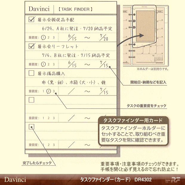 商品名: Davinci ダ・ヴィンチ A5サイズ システム手帳 リフィル タスクファインダー用カード 品番: DAR4304 サイズ: 横55×縦91mm 名刺サイズ (別売のDAR4601 ホルダーに収納可能です)) 入数: 50枚 仕様: 別売のタスクファインダーホルダーにセットする事で、取り組むべき重要なタスクを 常に確認できます。 手帳を開くと必ず見えるので忘れ防止に役立ちます! メーカー: 株式会社 レイメイ藤井 ※A5サイズのリフィルですサイズ違いには十分ご注意ください。 ※店頭及び他のモールと在庫を共有しておりますので、掲載中の商品でも欠品の場合がございますのであらかじめご了承ください。お急ぎの場合はメールで在庫の問い合わせをお願い致します。 システム手帳 リフィル A5タスクファインダー バイブルサイズリフィル タスクファインダー タスクフ... |