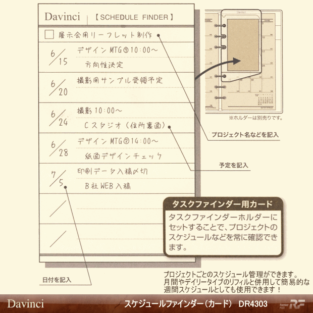 商品名 Davinci ダ・ヴィンチ バイブルサイズ システム手帳 リフィル スケジュールファインダー(カード) 品番 DR4303 サイズ 横55×縦91mm(名刺サイズ) 入数 50枚入り 仕様 タスクファインダーホルダー(DR4501/DAR4601)にセットすることで、システム手帳リフィルとして使えます。 メーカー 株式会社 レイメイ藤井 名刺サイズのカードなので、手帳のカードポケットや名刺入れ、名刺ファイルなどで保管もできます。 ※店頭及び他のモールと在庫を共有しておりますので、掲載中の商品でも欠品の場合がございますのであらかじめご了承ください。お急ぎの場合はメールで在庫の問い合わせをお願い致します。 日付入りリフィルバイブルサイズはコチラをクリック システム手帳 リフィル A5タスクファインダー バイブルサイズリフィル タスクファインダー... |
